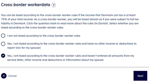 If you fulfil the requirement of at least 75 % of your total income from Denmark and want to be taxed under the cross-border rules, you should choose option 2 or 3.