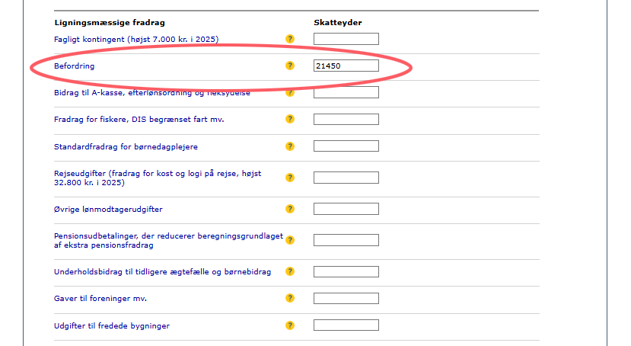 Lite längre ner på sidan kan du också ange avdrag i den personliga inkomsten. Som gränspendlare kan du få avdrag för transport till och från jobbet. Ange ditt reseavdrag under "Befordring".