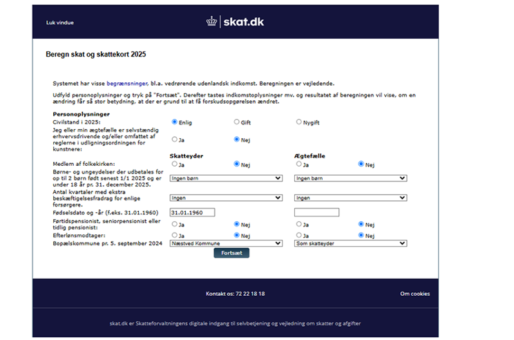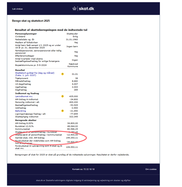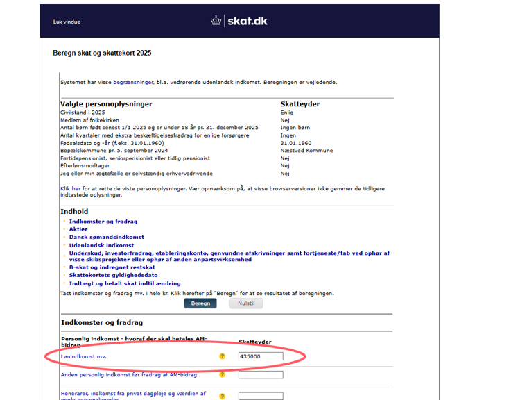 (Anledningen till att du för 2025 välja Næstved kommun, är att gränspendlare betalar den genomsnittliga kommunalskatten. Eftersom skattesatsen i Næstved år 2025 är den samma, ger det rätt beräkning.)