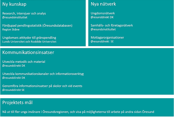 KOMMUNIKATIONSINSATSER består av en rad strategiska insatser för att öka ungas intresse och kunskap om den gränsregionala arbetsmarknaden i Öresundsregionen. Delprojektet ska baserat på ny kunskap utveckla ny metodik, nya kanaler och nytt informationsmaterial, samt marknadsföra budskapet till den unga målgruppen. Detta ska ske dels genom kampanjer på sociala medier och genom besök på t ex gymnasieskolor och mässor.